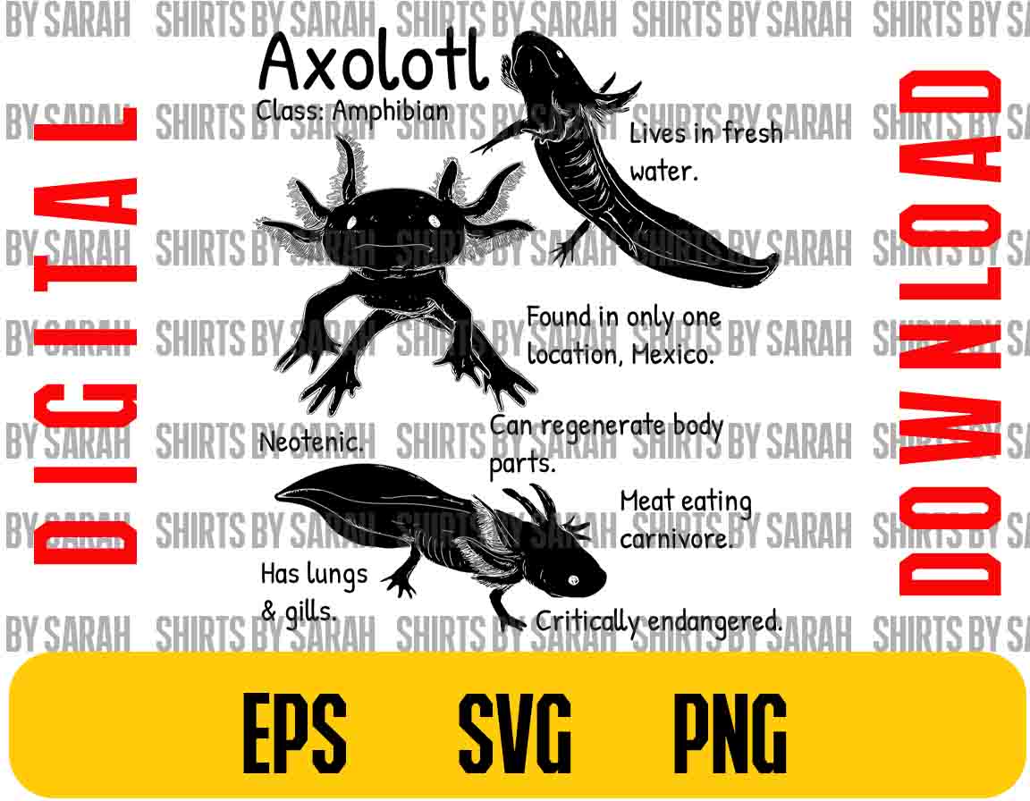 Discover the fascinating world of axolotls with our Axolotl Facts SVG Digital Download Catalog. This reference design clipart and educational shirt design file includes high-quality axolotl art in PNG and EPS formats, perfect for sublimation and posters. Learn about these unique creatures with scientific and objective language.